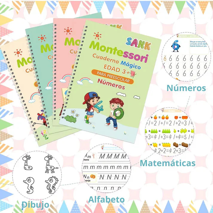 Aprender a escribir es clave en la vida de nuestros hijos, ya que marca el inicio de su educación. Con Set Cuaderno Magic Caligrafia Montessori, escribir, hacer matemáticas, dibujar y transcribir les resultarádivertido y atractivo, a la vez que mejorarán su caligrafía. Este producto no solo se centra en desarrollar estas habilidades, sino que también ayuda a los niños a familiarizarse más con el inglés y a aprenderlo.